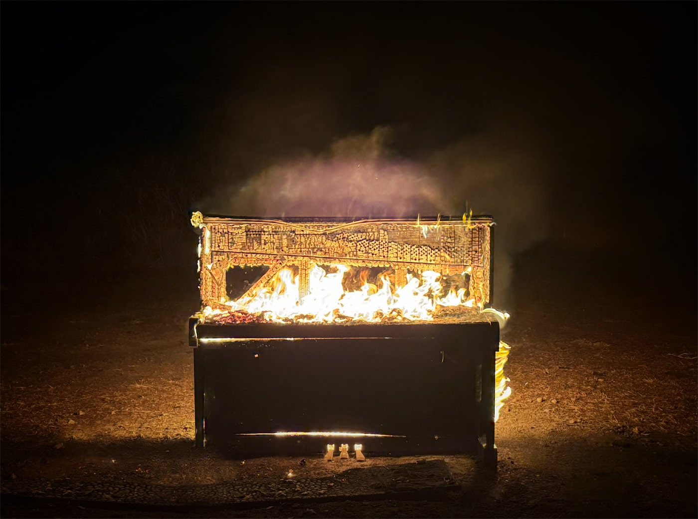 音楽、映像、パフォーマンスを横断する越境的な表現者、向井山朋子の美術館初大規模個展。本展は、アーツ前橋の6つのギャラリーを地下劇場に見立てた回廊型インスタレーションとして構成される。タイトルの“Act of Fire”は、作家の喪失・抵抗・怒りを燃焼させる儀礼的な空間を暗示すると同時に、ジェンダーや災害、侵略といった現実の問題を、〈火〉という根源的なメディアで照らし出す行為を示す。凝固した経血、燃え尽きるピアノなどの強烈なイメージ群が、〈私〉と〈世界〉の関係性を問う思索の旅へと誘ってくれる。