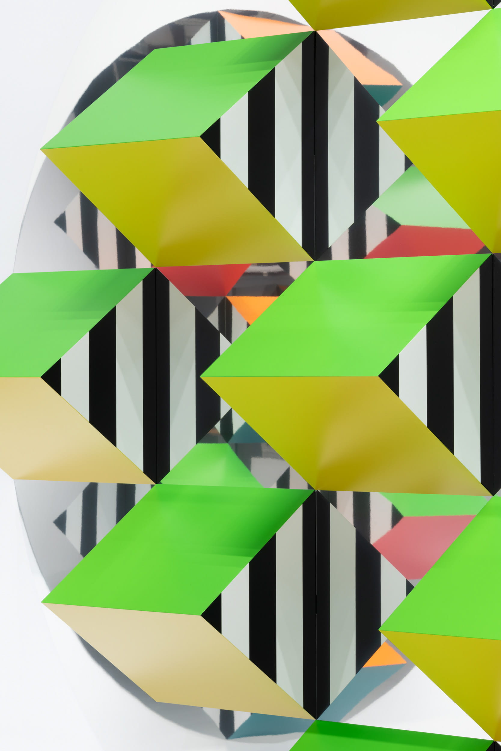 コンセプチュアル・アートの巨匠、ダニエル・ビュレン。1960年代から「視覚の道具」と称する8.7cm幅のストライプを記号に、美術制度の枠組みを問い直してきた。本展は、近年彼が深める「光」や「反射」へのアプローチを体現する新作《Prismes et mirroirs : Haut-relief (プリズムと鏡 :高浮き彫り)》シリーズで構成される。鏡面の支持体に多色の凸体(プリズム)を配した作品は、鑑賞者や周囲の環境を映り込ませ、平面と立体の境界を揺さぶる。それは、作品と環境が分かちがたく結びつく「借景」の思想とも共鳴し、見る行為そのものへの批判的視座を喚起する。
