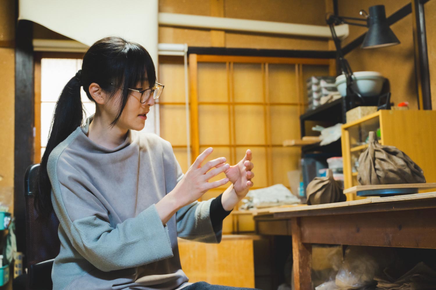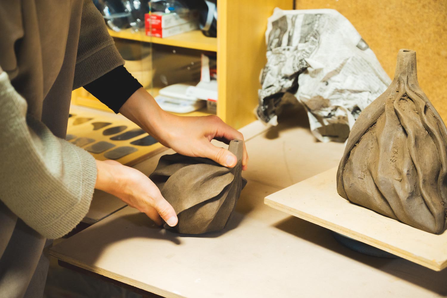 「空間を包むというアイディアは、学部生の頃に一度出てきていました。70センチほどの大きな作品を作る課題の最中、何もアイディアが浮かばなくて、とりあえず“手びねり”をしていたんです。作っている途中で重力に引っ張られて、真ん中あたりで土がぺたんと折れて。それがシワのように見えた瞬間に、手びねりって空間を包んでいる行為なんだ、という発見がありました」