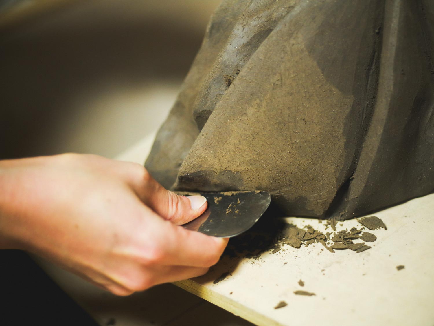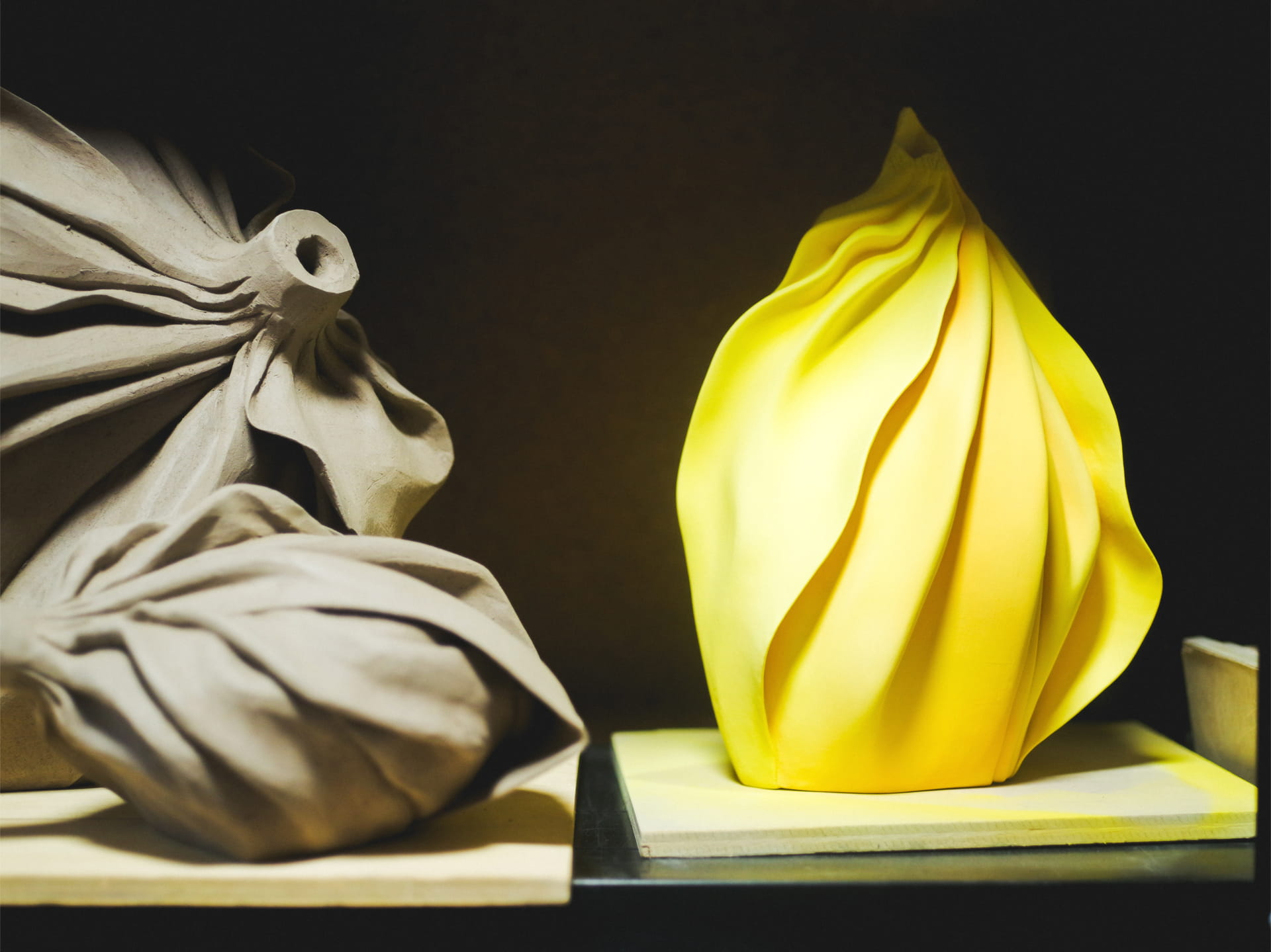 土と布の間にあるようなひだの形を目指しています。土を伸ばしていく力を利用して作る伸びやかでハリと勢いのある形や、土を触っている間に生まれる即興的な形などを取り入れているので、本物の布で同じように包んだ形を作っても実際は全然違う形になります。