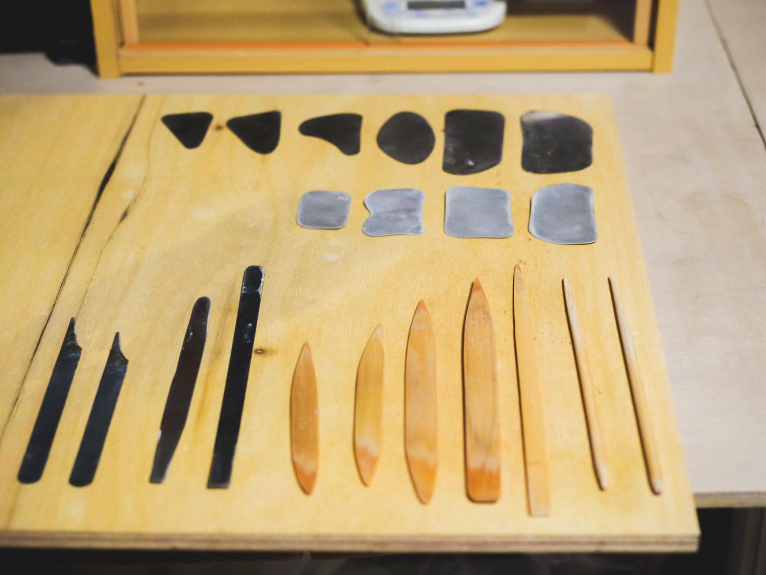 自分で制作した道具たちです。成型用の道具は限りなく自分の手に馴染むものであって欲しいため、自作することが多いです。例えばヘラは竹を削って作り、スクレーパーはノコギリの刃を切り取って制作しています。