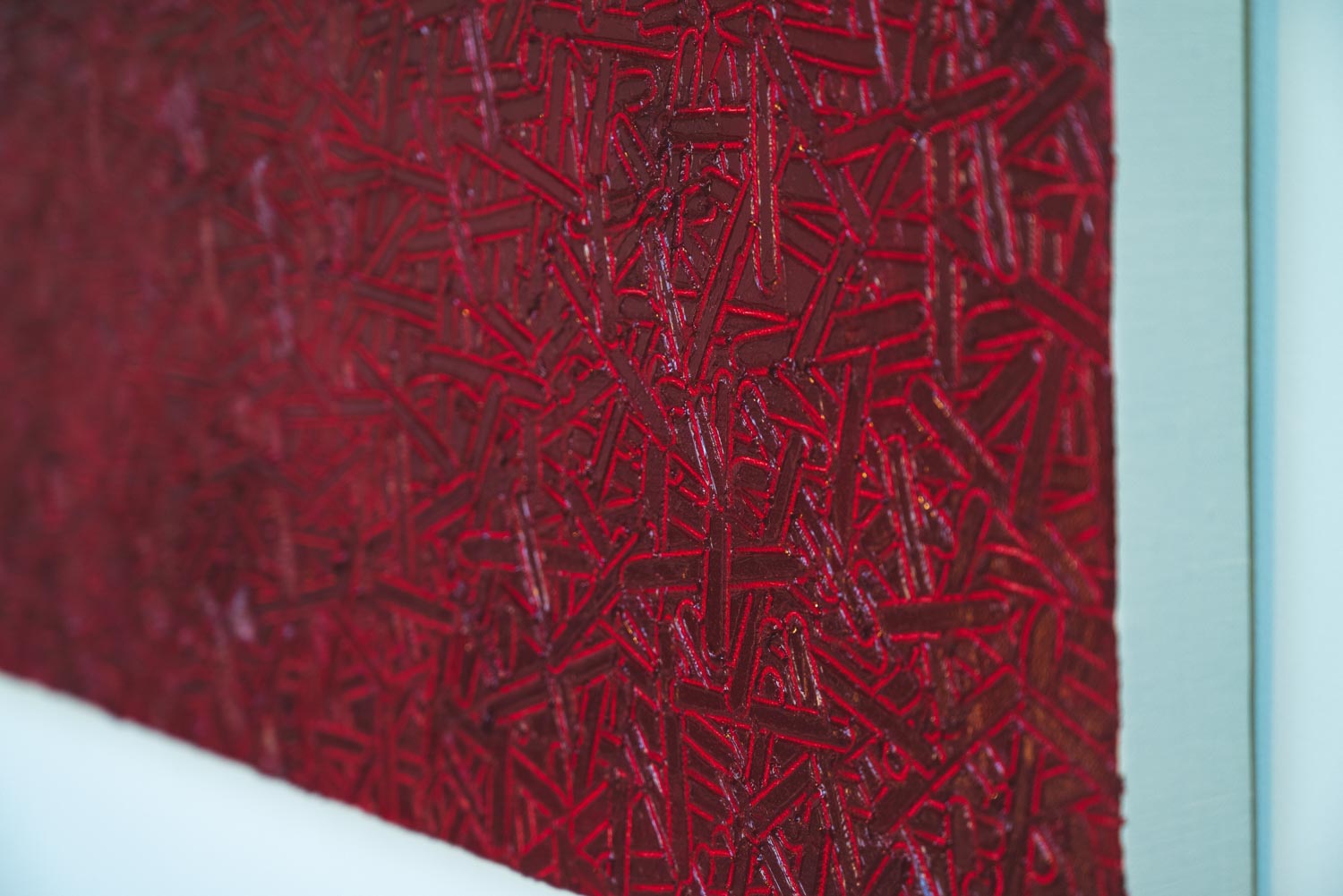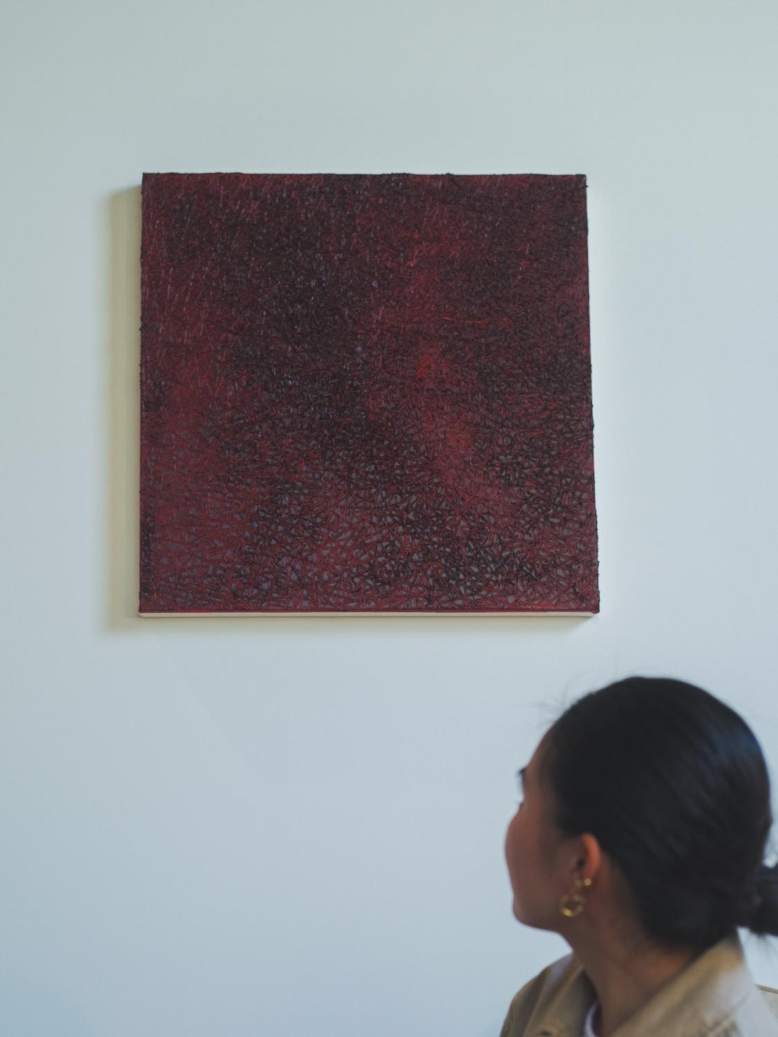 円をモチーフにするアーティストや、線をモチーフにするアーティストは思い浮かびますが、円でも線でもない“棒状の物体”としか言いようがない形をモチーフにするアーティストは、松山梨子さんくらいなものでしょう。シンプルな形でありながらも、一目で松山さんの作品だとわかる唯一無二の個性を持つ“棒状の物体”。じーっと観ていると、それらの“棒状の物体”はすべてフリーハンドで描かれており、一つとして同じ形がないことに気づかされます。世界に一つだけの花があるように、世界に一つだけの“棒状の物体”があるのです。