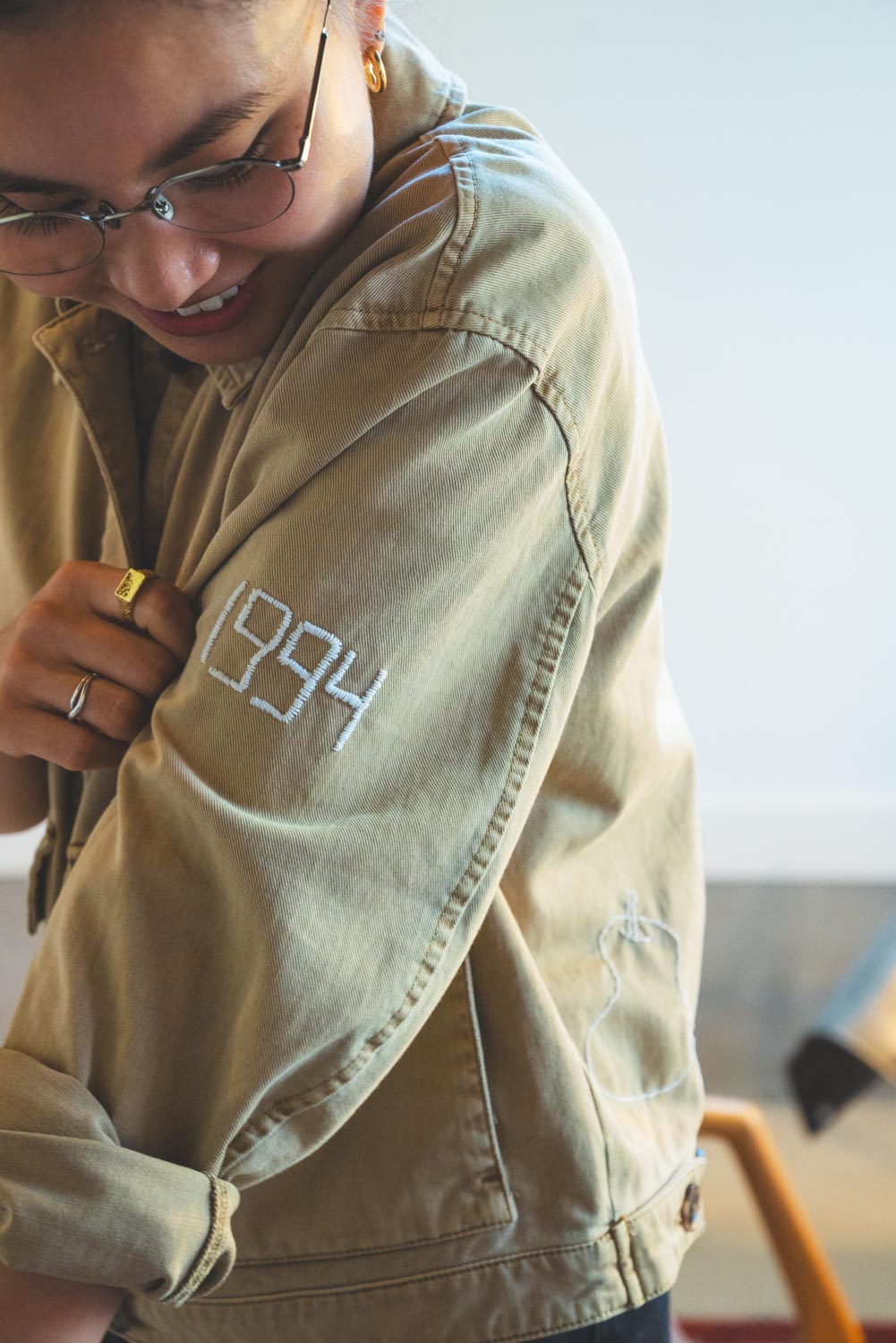 趣味の刺繍で仕立てたジャケット。「1994」は、両親が結婚した年だという