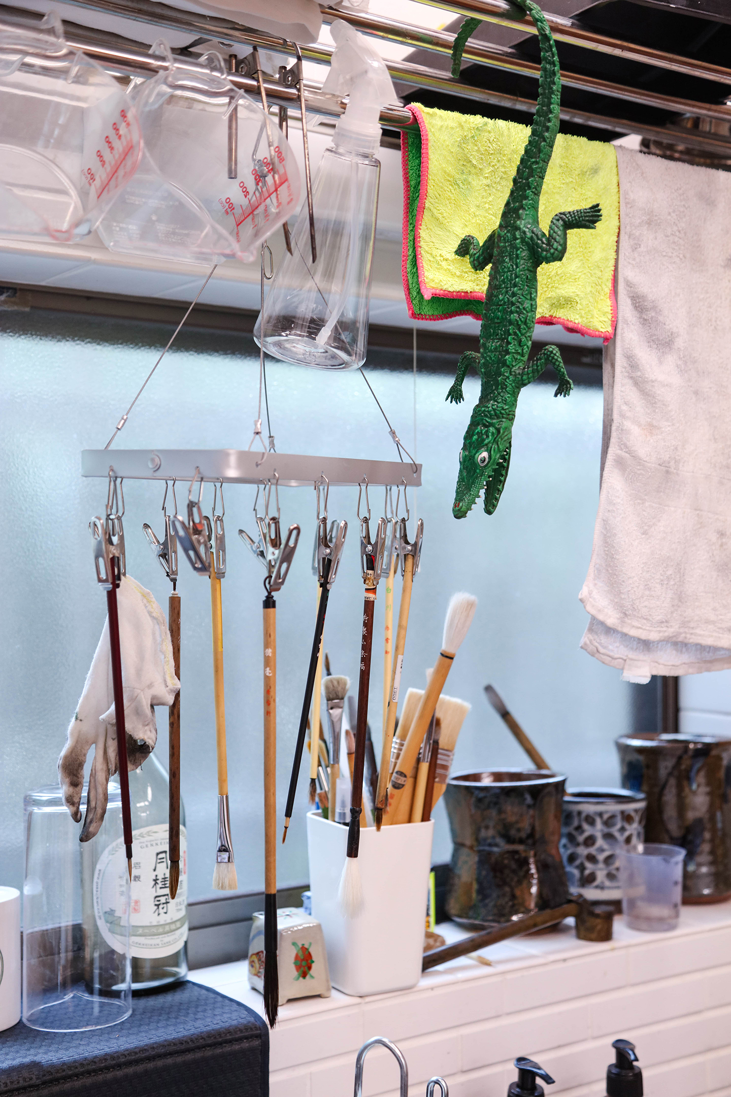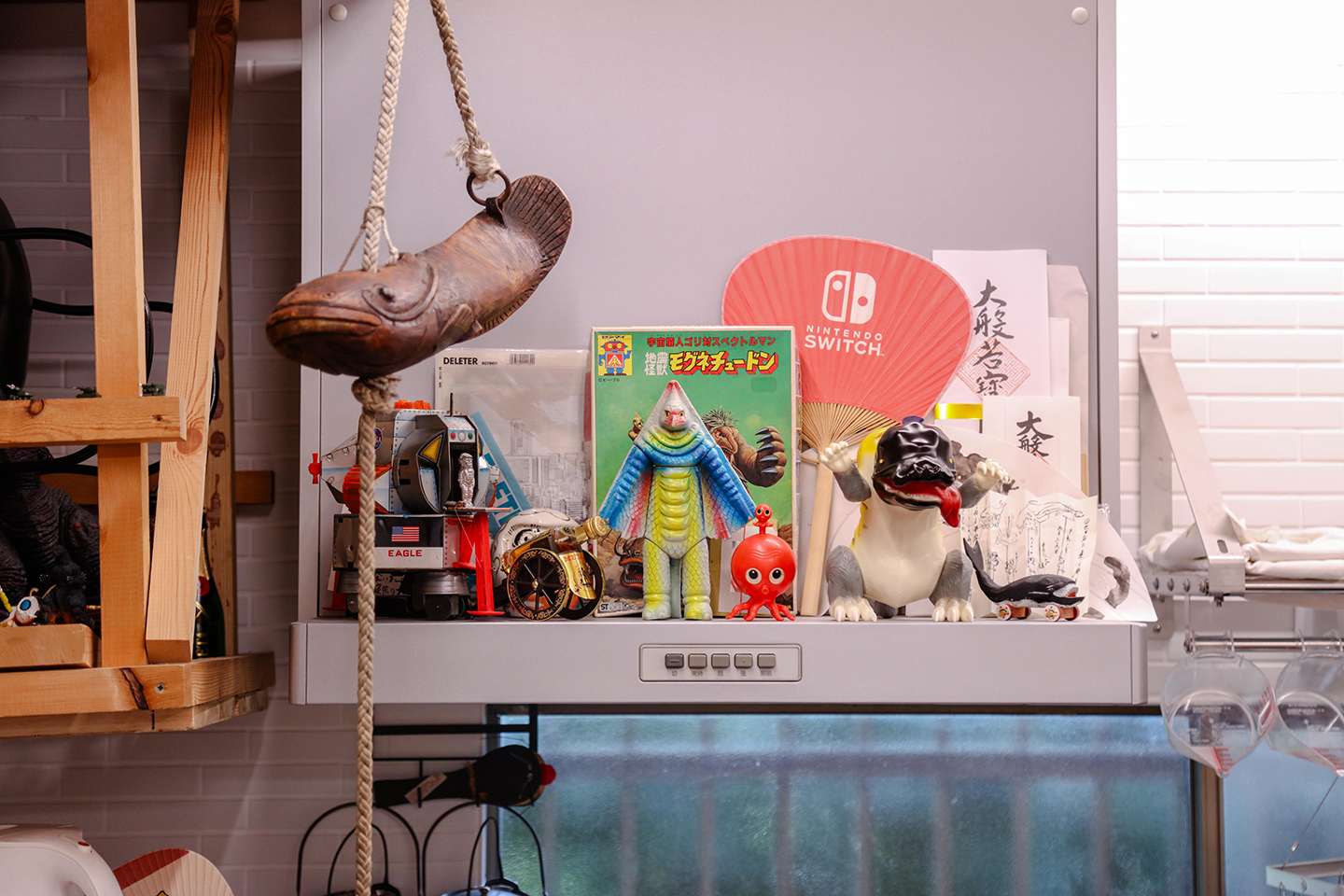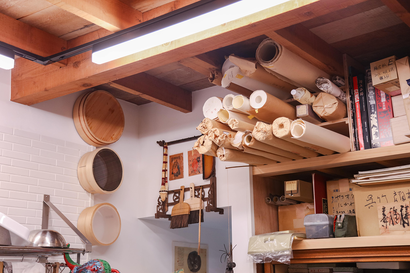 扉を開けると、硯で墨をする音がゆるやかに広がる。整然と並ぶ日本画の画材のあいだに、古物に吊るされた怪獣・ジャミラのソフビ。目を凝らすとゴジラの姿も。伝統の道具の中に、さりげない遊び心を覗かせる。