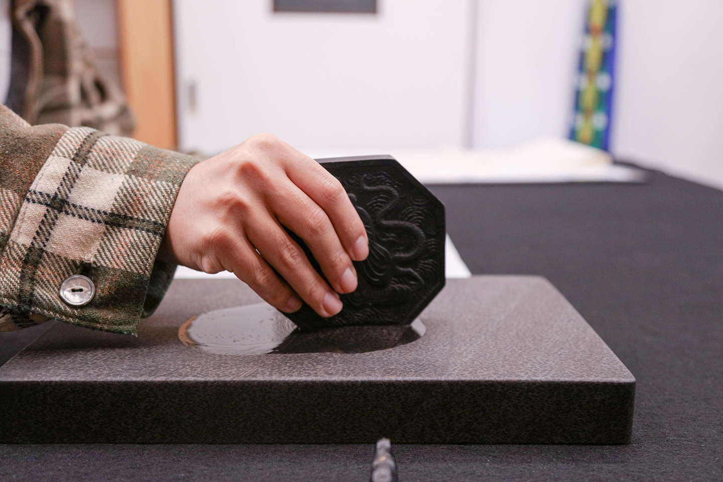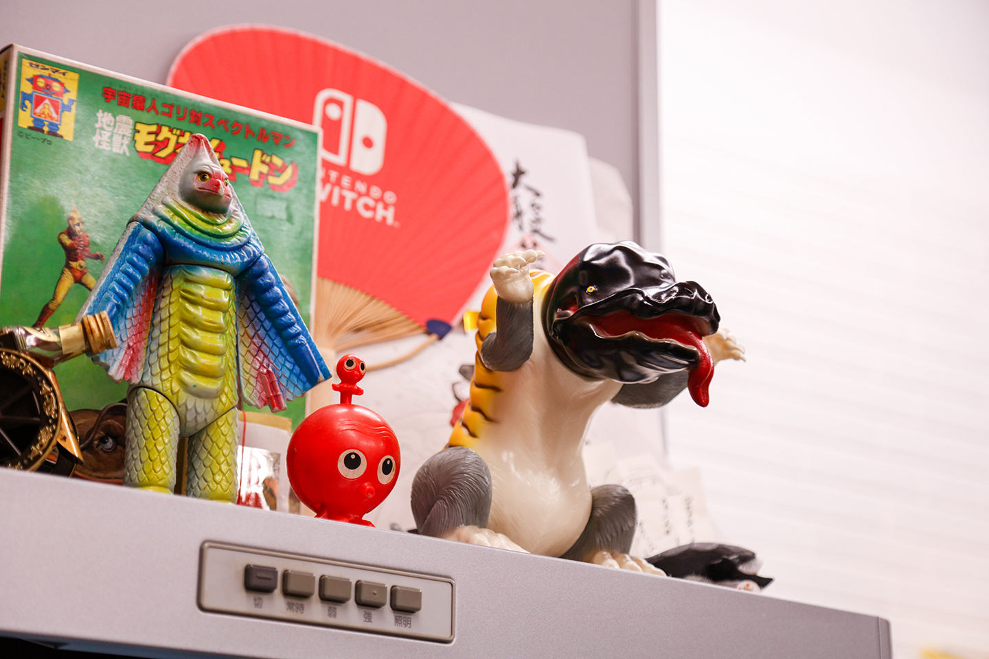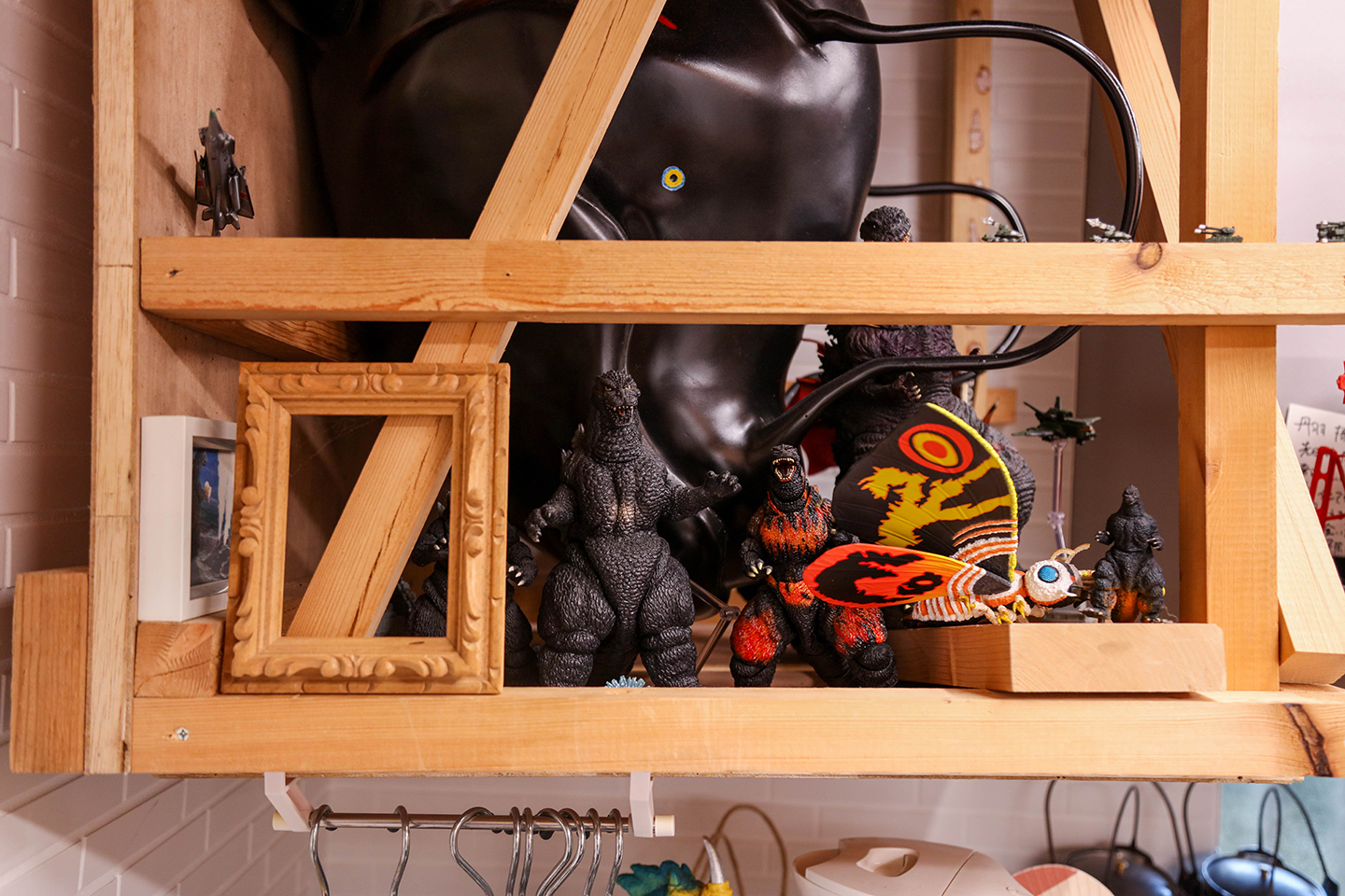 扉を開けると、硯で墨をする音がゆるやかに広がる。整然と並ぶ日本画の画材のあいだに、古物に吊るされた怪獣・ジャミラのソフビ。目を凝らすとゴジラの姿も。伝統の道具の中に、さりげない遊び心を覗かせる。