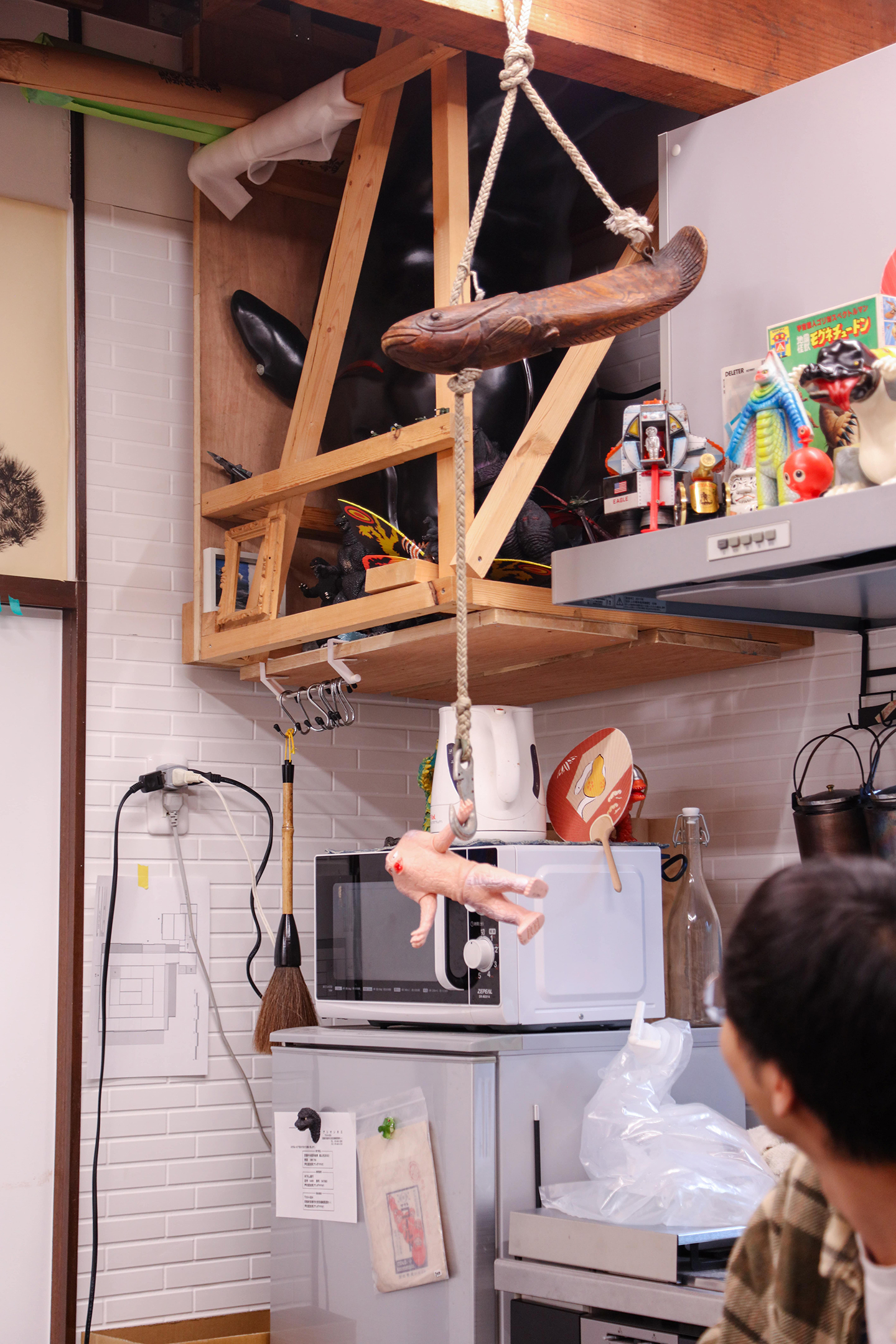 「もともと漫画とかサブカルチャーが好きなんですよ。アトリエにあるソフビも、高校の頃に通っていた中野ブロードウェイで買ったものです」と丹羽さん。チェックのシャツから覗くTシャツには、水木しげるのねずみ男と鬼太郎がちらり。特撮や漫画の世界観は、彼のコミカルな画風にもどことなく通じている。