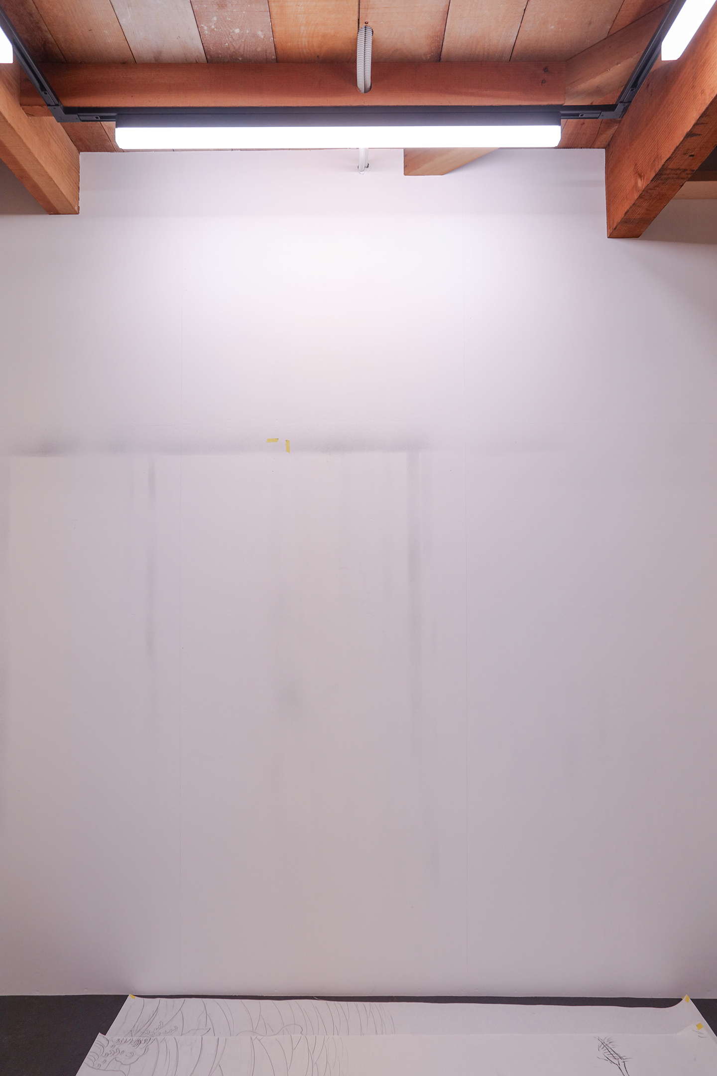 アトリエの大きな白壁と、独特の風合いを持つグレーの床材