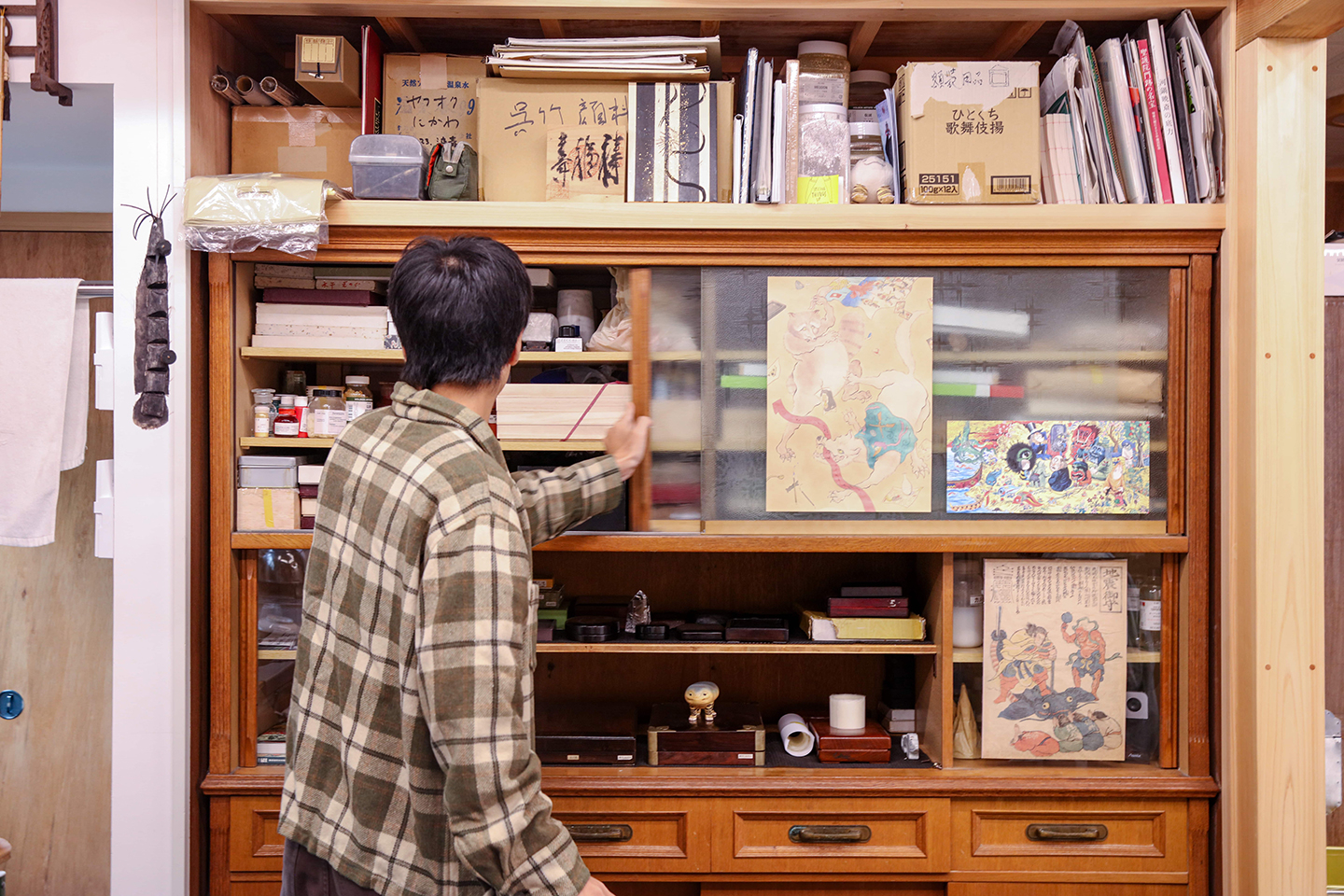 部屋にシンデレラフィットした棚は以前の家主のものだという。「これが重宝してまして、ここには岩絵具とか顔料系、向こうにある桐たんすには和紙や墨とか色々と入ってる感じですね」