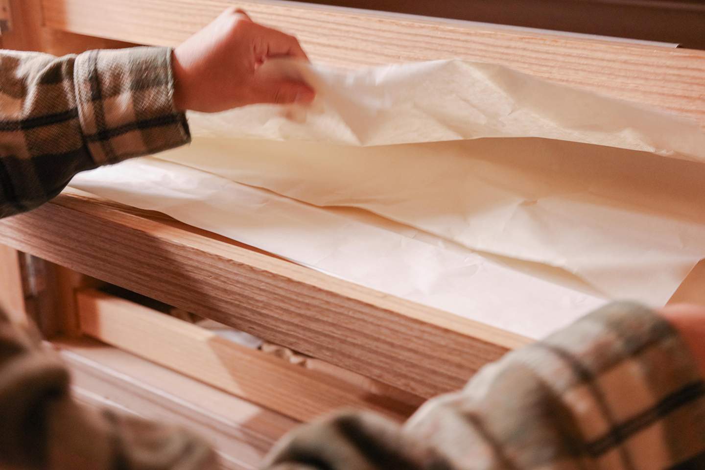立派な桐たんすの中には、古い和紙がいくつも収められていた。下の引き出しには墨や、顔料と膠を混ぜてつくった彩墨など。これらの素材をどのように使い分けているのだろうか。