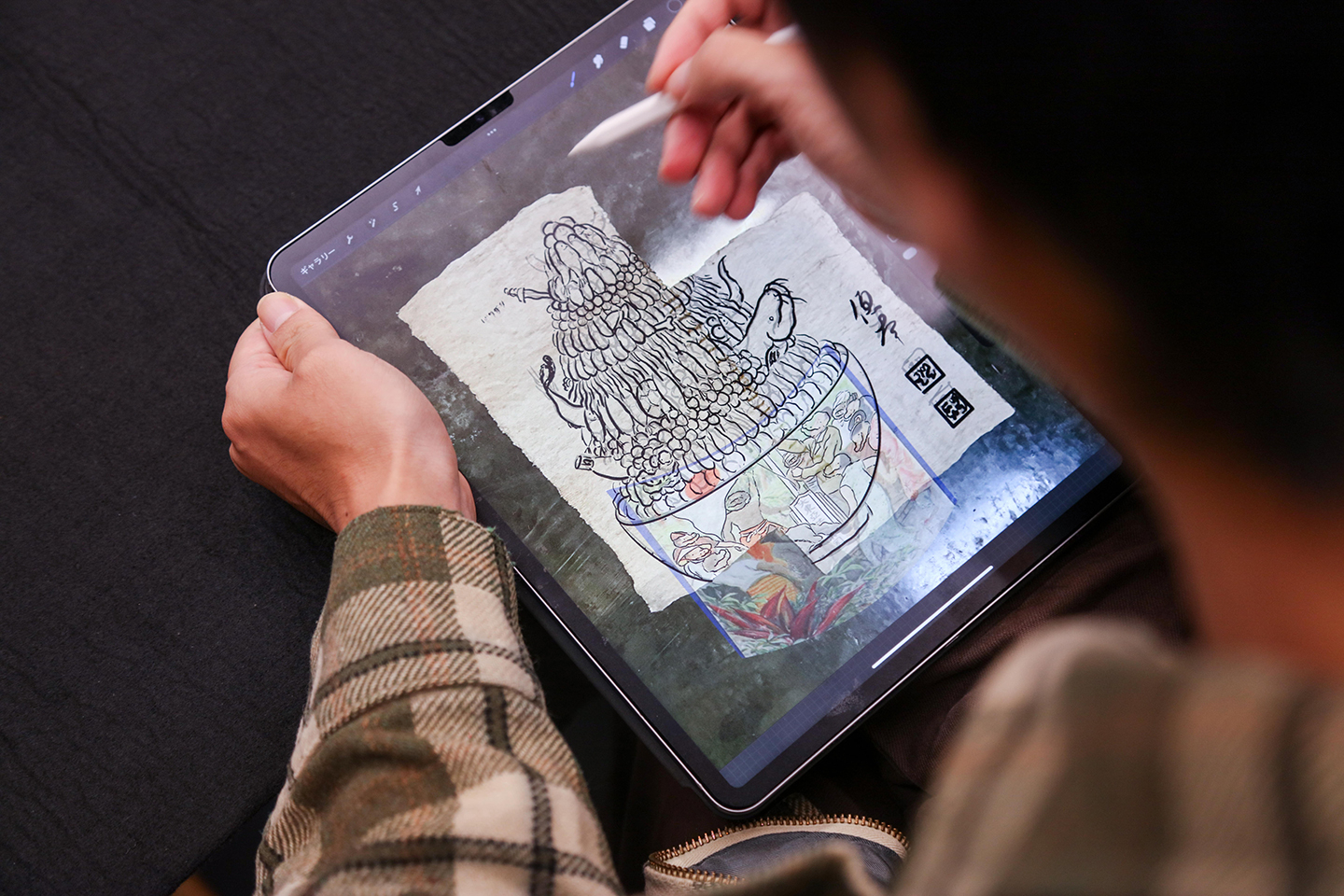 「最初は簡単なスケッチをして、そのあと原寸大の下絵を描いて、本画に写す感じですね。その下絵を、最近ではiPadと専用のペンシルで描いています。襖絵や貴重な古い和紙に描くことも多いので、写真を撮ってその上に重ねて描くことでイメージを膨らませるんです。今年の9月にインドネシアで滞在制作をしたときは、会場の写真にAIで“紙を垂らした”画像を生成して、その上にスケッチを描きました。やっぱり便利なものは、便利ですよ」
