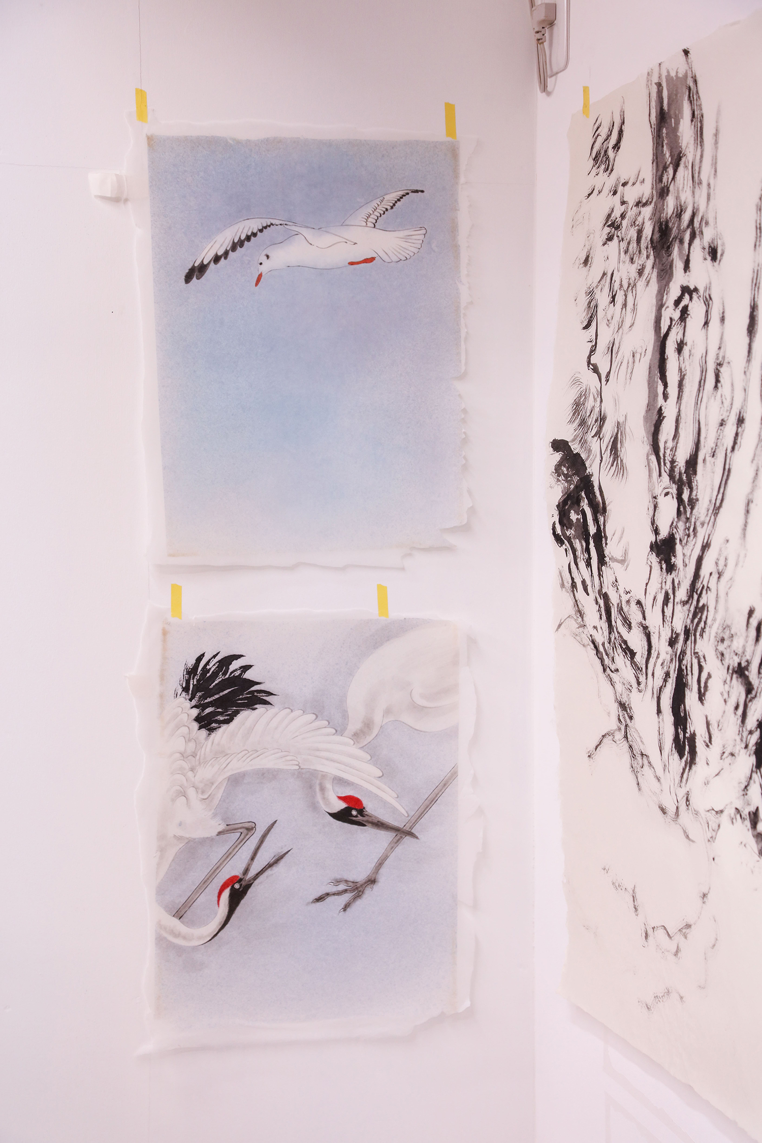 現在制作中の襖絵の下絵。「今のアトリエでは襖をギリギリ5枚くらいまで並べることができるのも便利なんです」