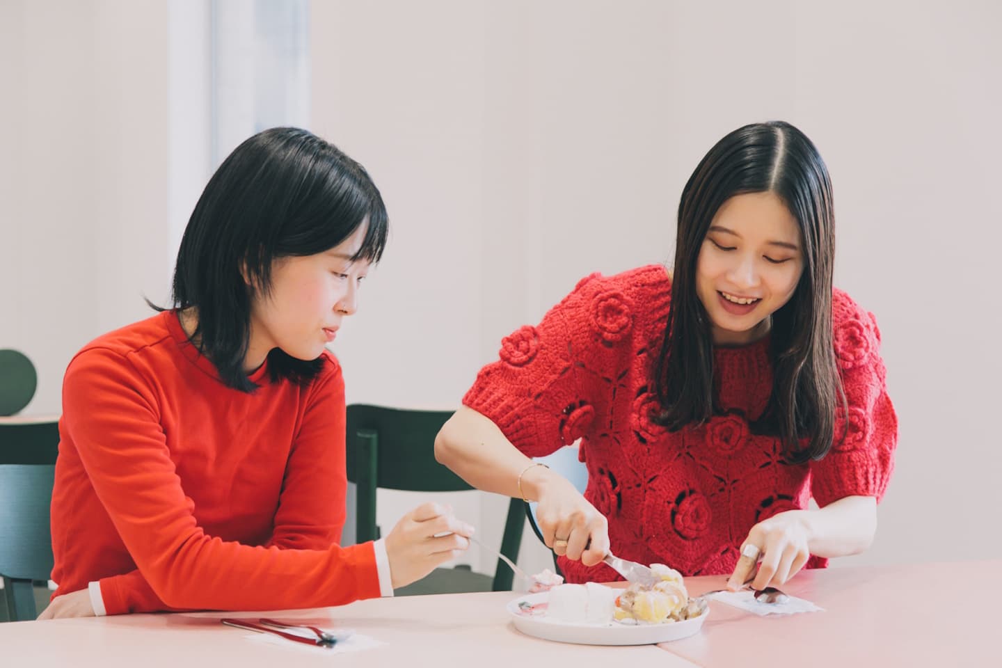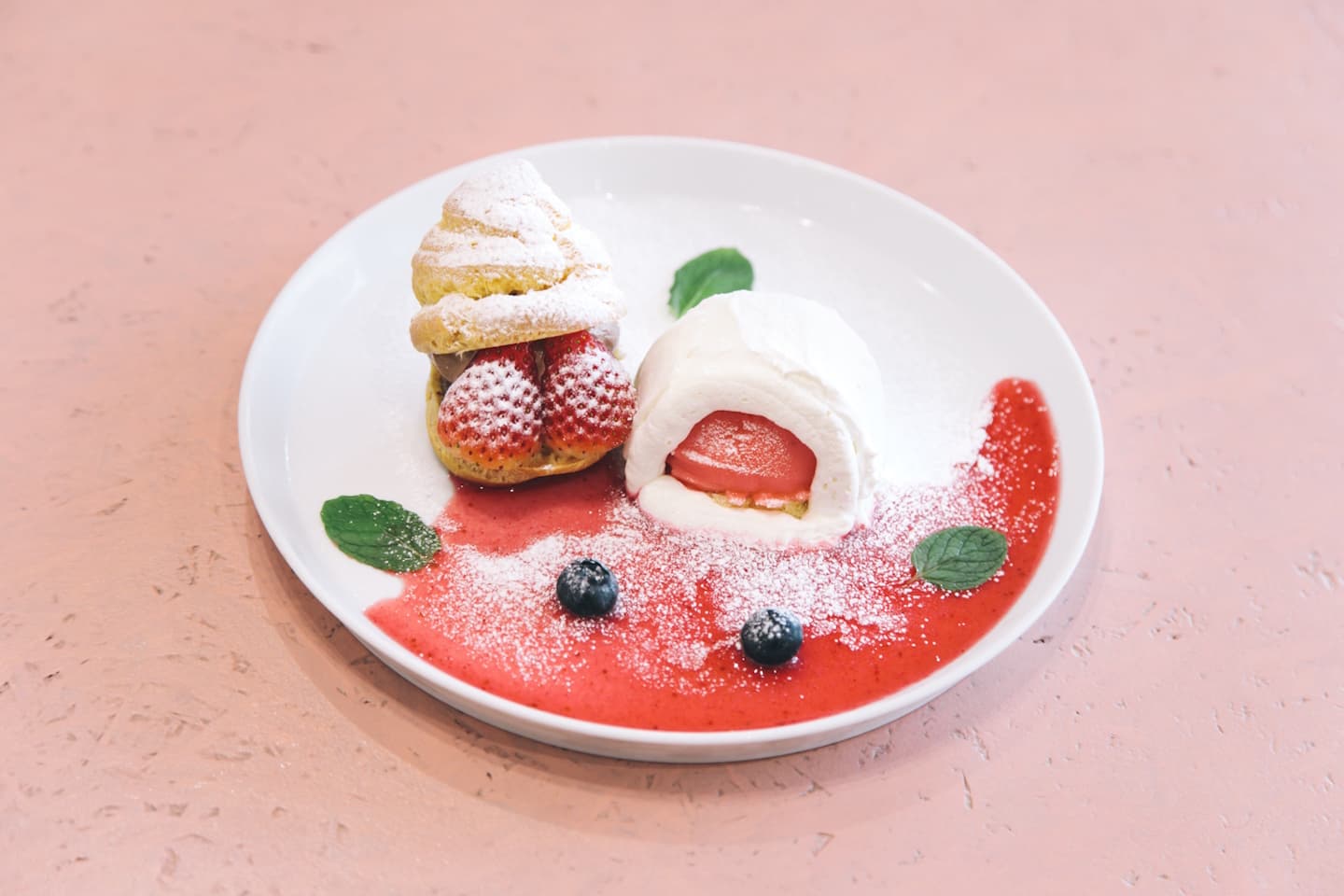 横浜美術館に併設されたカフェ「馬車道十番館 横浜美術館 喫茶室」にて。『いつもとなりにいるから 日本と韓国、アートの80年』の期間中、オリジナルメニュー「いちごのおしゃべり」を注文できる(各日数量限定)