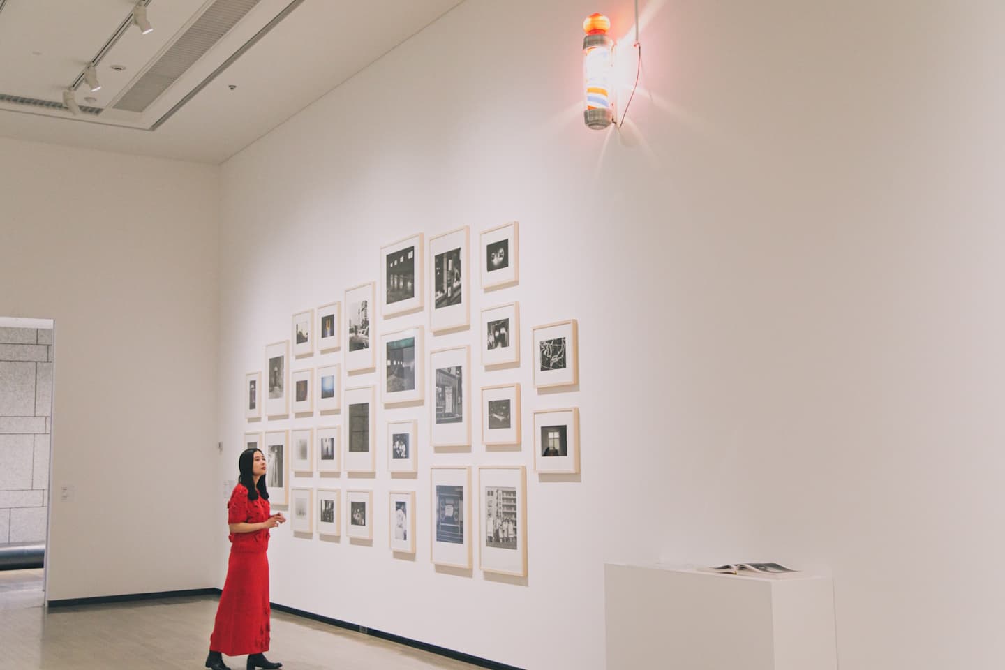 横浜美術館『いつもとなりにいるから 日本と韓国、アートの80年』展示ビジュアルの前で