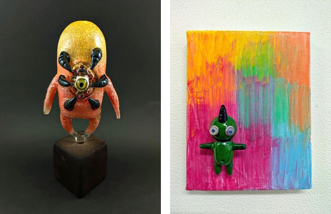 三平硝子は、生活の中での体験や社会現象、個人的な感情をモンスターとして再構築し、ボロシリケイトガラスを用いたバーナーワーク技法により立体作品として表現。高温の炎の中で形づくられるガラス作品は、透明感と緊張感を併せ持ち、見る者に強い印象を与える。