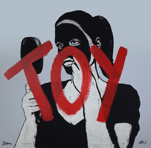 DOLK 「Grey Balaclava with red toy tag」 Silkscreen & Acrylic paint 65×65cm