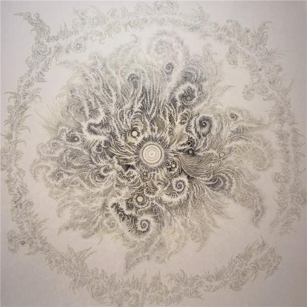 近作の《ひとつのはじまりからNo.1》(2025)のような作品では、太陽や月の周りを雲が動く像、超新星爆発の生成と崩壊、植物や水のパターンなど複数のイメージが起点になり、スケッチを重ねて蓄積された形が響き合う。「単体のモチーフを決めてなぞるのではなく、下書きなしで、描きながら生まれる像を受け取る」のがシリーズの特徴だという。
