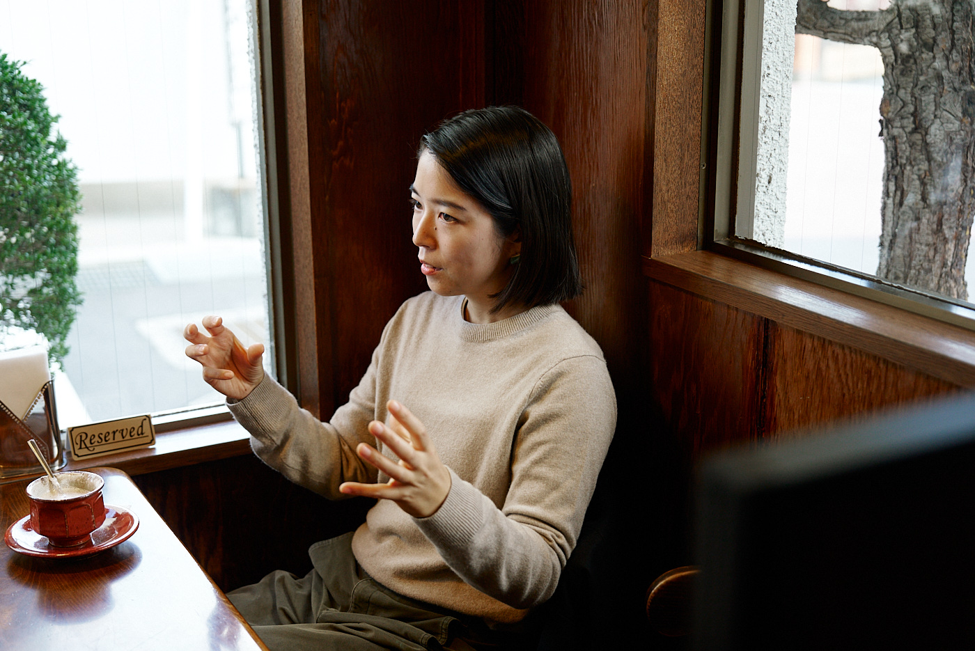 制作していて寒くなってきたら暖かいものを飲みに来るんですけど、定食とかもやっているので、お昼に食べにくる場合もあります。あとは陶芸の森に来ている作家のみんなで食べに来たり。信楽で一番古い喫茶店なので観光の人も来られるんですけど、地元の職人やアーティストも来ていて色々な情報が飛び交っているので、よく聞き耳を立てています(笑)。内装も落ち着く感じで、お皿やカップも素敵な陶器で出してくれるので、好きなお店です。
