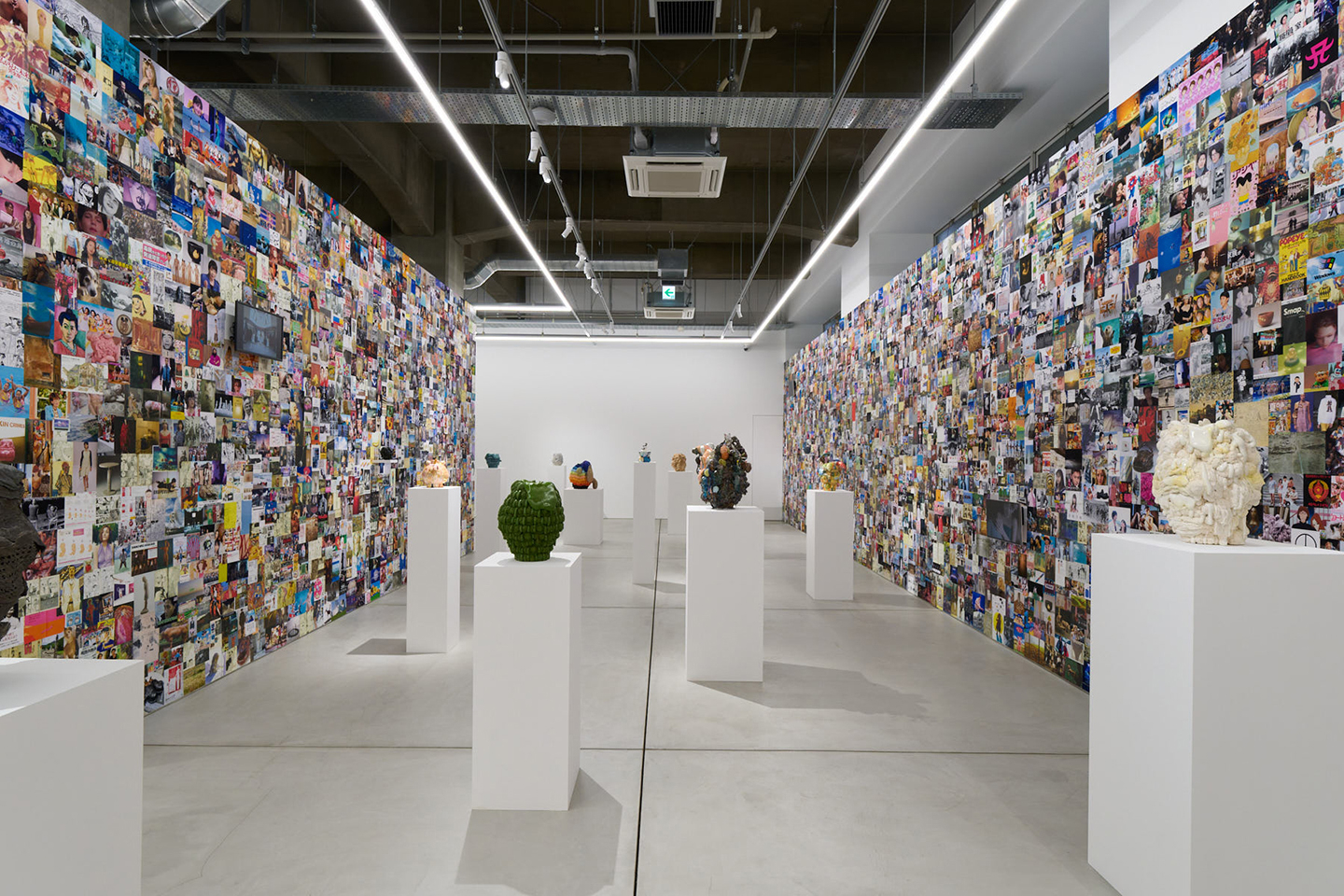 個展「神様、もう少しだけ」の様子。陶芸作品柄並ぶ会場の壁には川井さんが集めたエンタメやファッション、カルチャー作品のイメージが無数に貼られていた